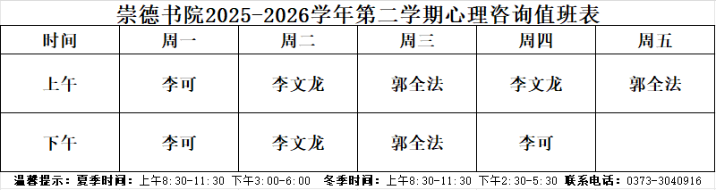 崇德书院2025-2026学年第二学期心理咨询值班表